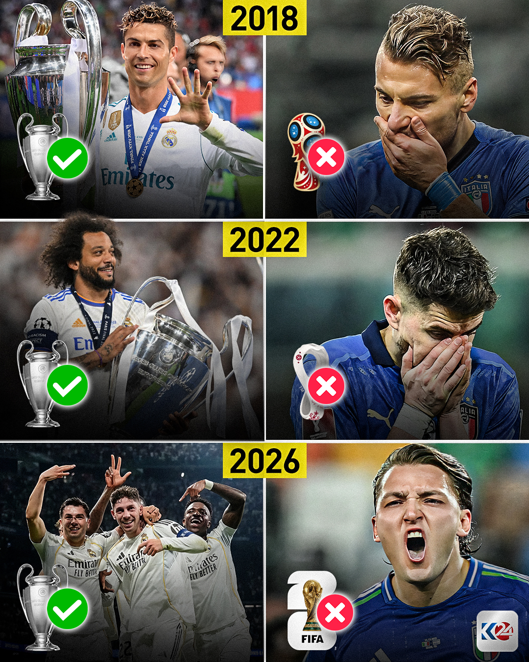 لە مێژوودا هەر کاتێک ئیتاڵیا شکستی هێنابێت و بەشداری مۆندیالی نەکردبێت، ریاڵ مەدرید لەو ساڵە ناسناوی چامپیۆنزلیگی بەدەستهێناوە، بۆیە هاندەرانی یانە شاهانەکە بەو هیوایەن ئەمساڵیش کە ئیتاڵیە سەرنەکەتووە بۆ مۆندیال، یانەکەیان ناسناوی چامپیۆنزلیگ بباتەوە.