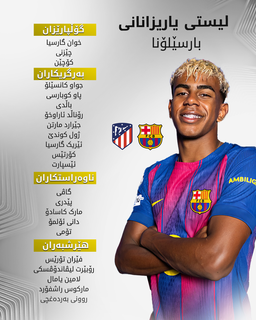 لامین یامال و رۆبێرت لێڤاندۆڤسکی سەرکردایەتی پێکهاتەی یانەکەیان و رافینها یاریزانی بەڕازیلیش کە پێکانی هەیە، بۆ ئەم یارییەش بانگهێشت نەکراوە و بەشداری یارییەکە ناکات. هەروەها دی یۆنگ ناوەڕاستکاری هۆڵەندی ئەو یاریزانەش بەهۆی پێکان بانگهێشت نەکراوە.