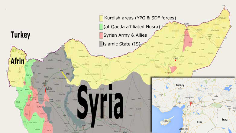 Afrin, which is under the control of the Kurdish forces of People’s Protection Units (YPG), is under siege and is separated from the other Syrian Kurdish areas by Islamic State (IS) and al-Qaeda-affiliate, Nusra, from the east, Syrian Army from the south, and the blocked Turkish borders from the north and west.