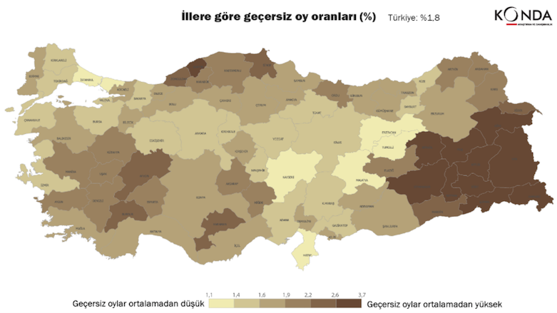 [A map showing the amount of spoiled ballots by province. The darker brown, the higher percentage. Source: KONDA]