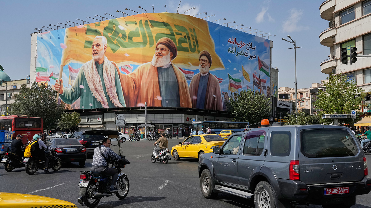 People drive past a huge banner showing the late commander of the Iran's Revolutionary Guard expeditionary Quds Force, Gen. Qassem Soleimani, who was killed in a U.S. drone attack in 2020, and two late Hezbollah leaders Hassan Nasrallah, center, and Hashem Safieddine, who were killed in Israeli airstrikes in 2024, at the Enqelab-e-Eslami (Islamic Revolution) square, in Tehran, Iran, Saturday, Sept. 27, 2025. (AP)