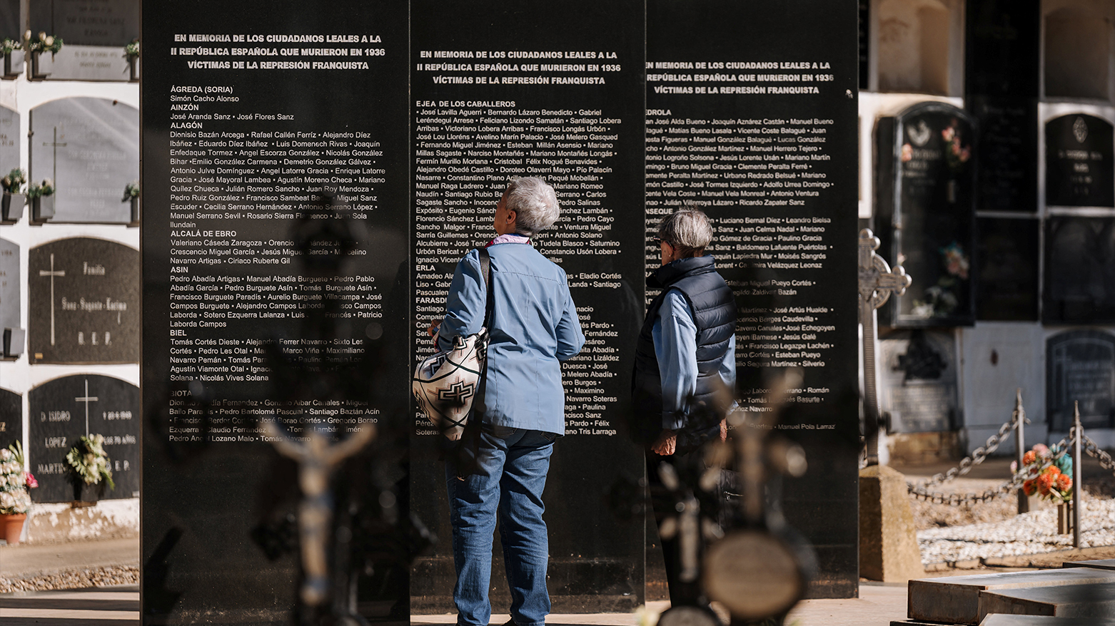 Relatives of the victims of repression during the Spanish Civil War and the Franco regime look at the names written on the monument that honors 417 dead in the cemetery of Ejea de los Caballeros, Ejea de los Caballeros, in Zaragoza province, on October 28, 2025. (AFP)