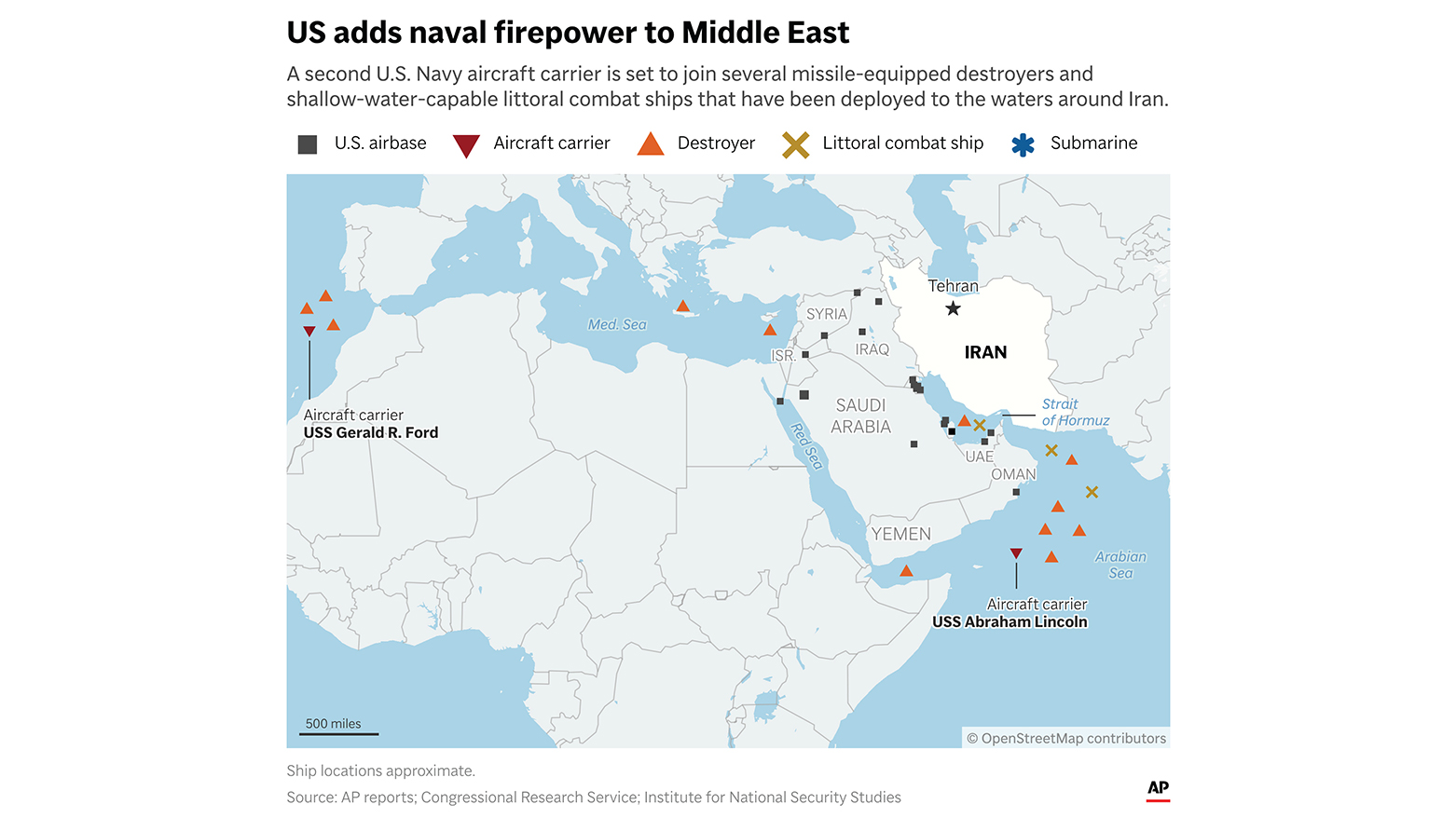 The report added that the U.S. Navy has 13 ships in the region, including the aircraft carrier USS Abraham Lincoln and nine destroyers capable of intercepting ballistic missiles or launching Tomahawk cruise missiles. The aircraft carrier USS Gerald R. Ford is also en route to the region.