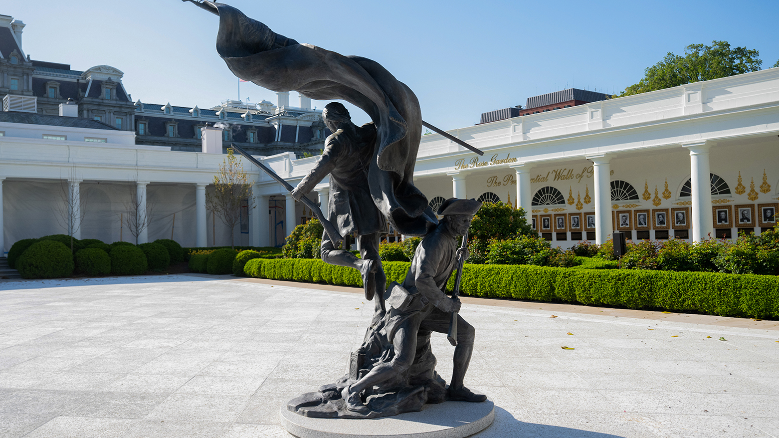 What is taking shape, then, is not simply a monument and a sculpture, but a presidential attempt to organize the visual language of the capital around a particular reading of the republic’s origins. The Rose Garden piece invokes the Revolutionary War in compact form.