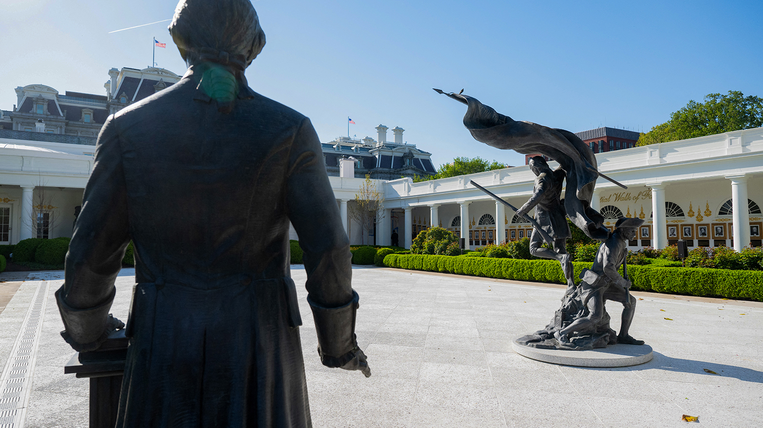 On a Friday of curated history at the White House, a Revolutionary War bronze settled into the Rose Garden while renderings of a 250-foot arch rose across the Potomac in projection alone—two monuments advancing the same claim: that the nation’s 250th anniversary can be built in stone, and in skyline