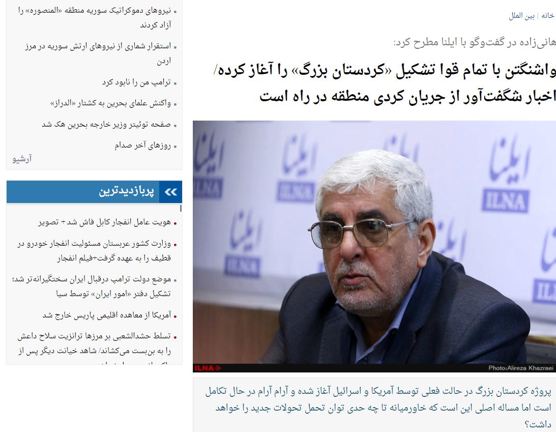 خبرگزاری کار ایران، بە نقل از هانیزادە نوشتە است: در روزهای اخیر شاهد بودیم که کمیته مستقل انتخابات اقلیم کردستان عراق از آمادگی خود برای برگزاری همهپرسی استقلال سخن گفته بود و به احتمال زیاد همهپرسی استقلال در این ناحیه برگزار خواهد شد اما زمان دقیق آن مشخص نیست. از این جهت باید توجه کرد که تشکیل «نوار کردی» متشکل از مرزهای ترکیه، سوریه و نهایتاً عراق، طرح سنتی اسرائیل مبنی بر تحقق بحث از نیل تا فرات را جامه عمل خواهد پوشاند. لذا با توجه به شرایط فعلی و با عنایت به اظهارات مسئولان اقلیم کردستان عراق و همچنین برجسته شدن نقش کردهای تحت حمایت آمریکا در سوریه برای مبارزه با داعش، در ماههای آینده به خصوص پس از آزادسازی کامل موصل شاهد رخدادهای بسیار مهم و تعجبآور خواهیم بود.