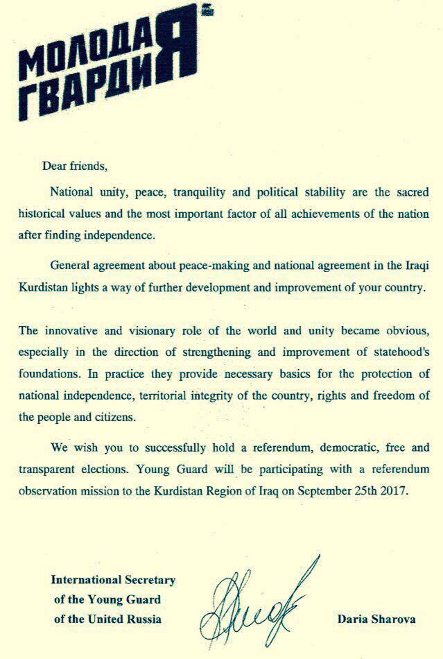 داریا شارووا دبیر بین المللی گارد جوانان حزب روسیه متحد در نامهای به فلاح مصطفی مسئول اداره روابط عمومی دولت اقلیم کردستان اعلان کرده است از ملت کردستان و همهپرسی حمایت میکنند.
