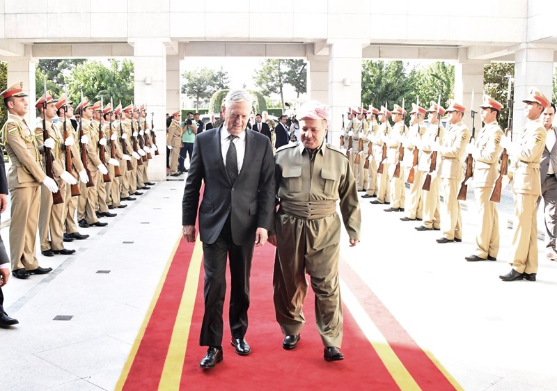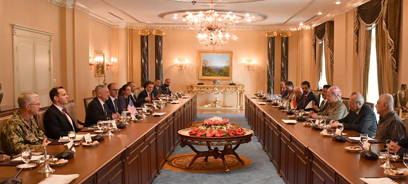 مسعود بارزانی رئیس اقلیم کردستان روز سهشنبه 31 مرداد 1396 از جیمز متیس وزیر دفاع ایالات متحده آمریکا و هیات همراه متشکل از برت مکگورک نماینده رئیس جمهوری آمریکا در ائتلاف بین المللی و داگلاس سلیمان سفیر آمریکا در عراق و شماری از مقامات و مشاوران وزارت دفاع آمریکا استقبال کرد.