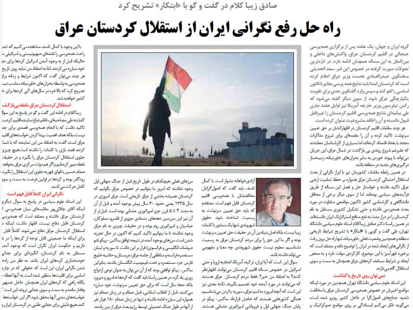 بە گزارش این روزنامە، در همین راستا دکتر صادق زیباکلام استاد علوم سیاسی دانشگاه تهران، طی گفت و گویی با «ابتکار» با تشریح شرایط تاریخی منطقه و همچنین وضعیت فعلی خاورمیانه، تنها راه حل برون رفت از نگرانی‌های ایجاد شده در ایران را توضیح داده و معتقد است که برخورد قهرآمیز با این موضوع، کارکردی موقت دارد و به محض ایجاد بر شرایط مساعد، کردهای عراق همچنان به سمت و سوی استقلال گام می‌دارند.