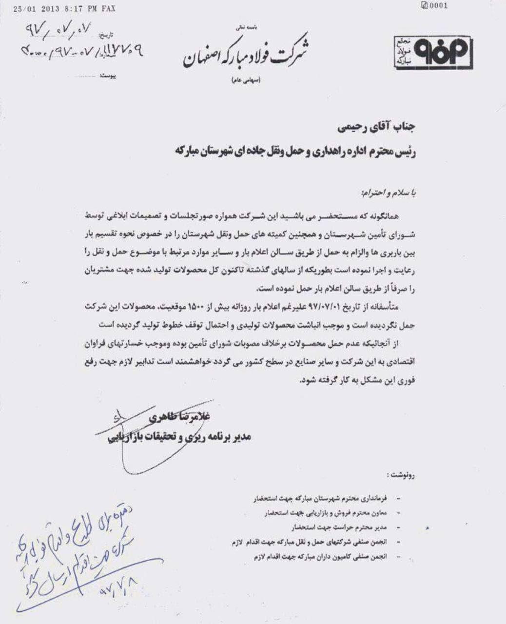 شرکت فولاد اصفهان روز شنبه هفتم شهریور در نامهاش نوشته است: از تاریخ 01/07/97 علیرغم اعلام بار روزانه بیش از 1500 موقعیت، محصولات این شرکت حمل نگردیده است.