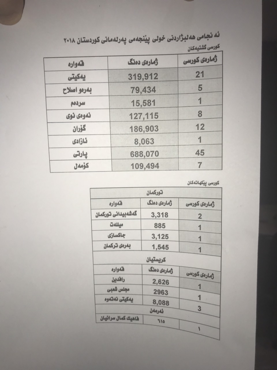 از مجموع 110 کرسی پارلمان کردستان، پنج کرسی به اقلیت مسیحی و پنج کرسی هم به اقلیت ترکمن اختصاص داده شده است.