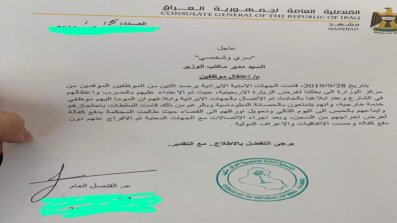 در نامه کنسولخانه عراق در مشهد امده است, این دو کارمند یک شب را در زندان بسر برده اند و سپس به دادگاه برده شده و دادگاه به قید وثیثه انها را آزاد کرده است.