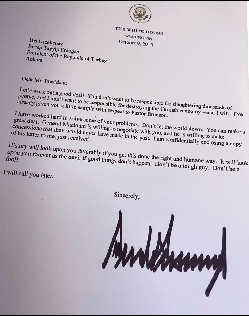 رئیس‌جمهوری آمریکا،  در این نامه نوشته است: بیایید برای دستیابی به یک توافق خوب همکاری کنیم. شما مایل نیستید مسئول کشتار هزاران نفر باشید، من هم نمی‌خواهم مسئول نابود کردن اقتصاد ترکیه باشم، (قطعاً این کار) را خواهم کرد.
