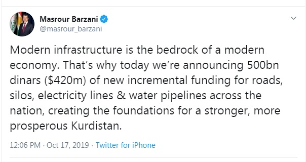 نخستوزیر اقلیم کردستان روز پنجشنبه ۲۵ مهرماه، با انتشار توییتی از اختصاص ۵۰۰ میلیارد دینار جهت اجرای چند طرح اساسی در اقلیم کردستان خبر داد.