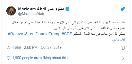 مظلوم کوبانی در توئیتر بعد از خبر کشته شدن بغدادی نوشت: بمدت 5 ماه کار اطلاعاتی دقیق صورت گرفته تا نهایتا در عملیاتی مشترک, تروریست ابوبکر بغدادی کشته شد.