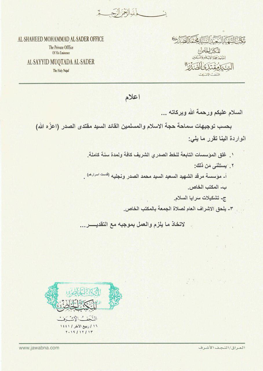 مدیریت مرقد "سید محمد صدر"، (پدر سید مقتدی صدر) و دفتر ویژهی صدر و تشکیلات سرایا السلام (شاخهی نظامی جریان صدر در نیروهای الحشد الشعبی) از این دستورالعمل مستثنا شدهاند.