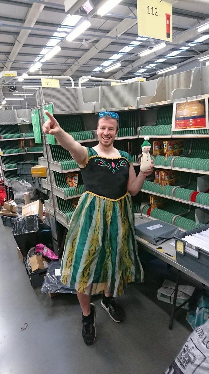 گلن والتون، پستچی بریتانیایی، ضمن انجام وظیفهی شغلیاش برای رساندن نامهها و بستههای پستی، با لباسهای کشتیگیران، شاهزاده خانمها، دزدان دریایی و پیکچو در بازی پوکیمون(Pokemon) ، جلوی خانههای مردم ظاهر شده و از این راە برای دقایقی آنها را از فضای خانه دور میکند و برایشان لحضاتی شاد میآفریند.