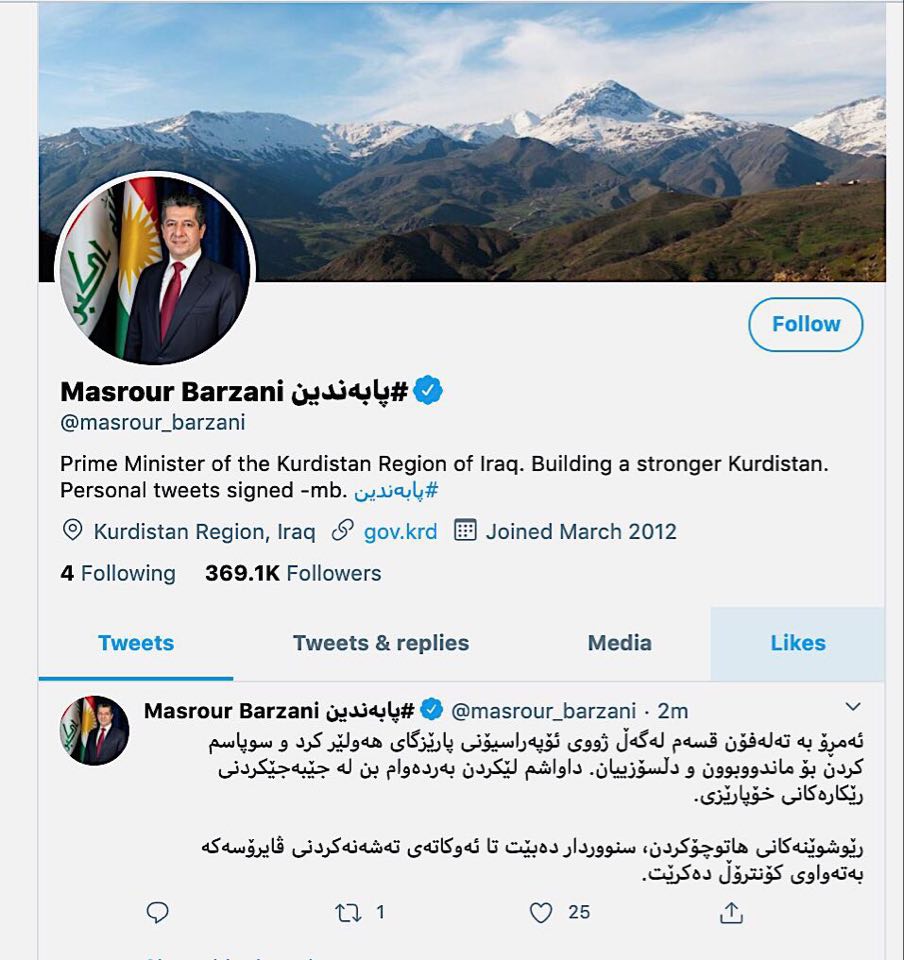 مسرور بارزانی، نخست وزیر اقلیم کردستان، امروز سهشنبه 26 فروردین، در یک پیام توئیتری اعلام کرد:" امروز با اتاق عملیات استان اربیل گفتگوی تلفنی داشتم و از آنها به خاطر زحمات و دلسوزیهایشان تشکر کردم. همچنین از آنها خواستم که در اجرای مقررات حفاظت از سلامت، مستدام باشند".