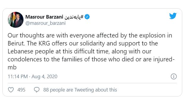 مسرور بارزانی در ادامه‌ی این توییت نوشت: " دولت اقلیم کُردستان در این شرایط سخت همدردی و حمایت خود از مردم لبنان را اعلام می‌دارد.