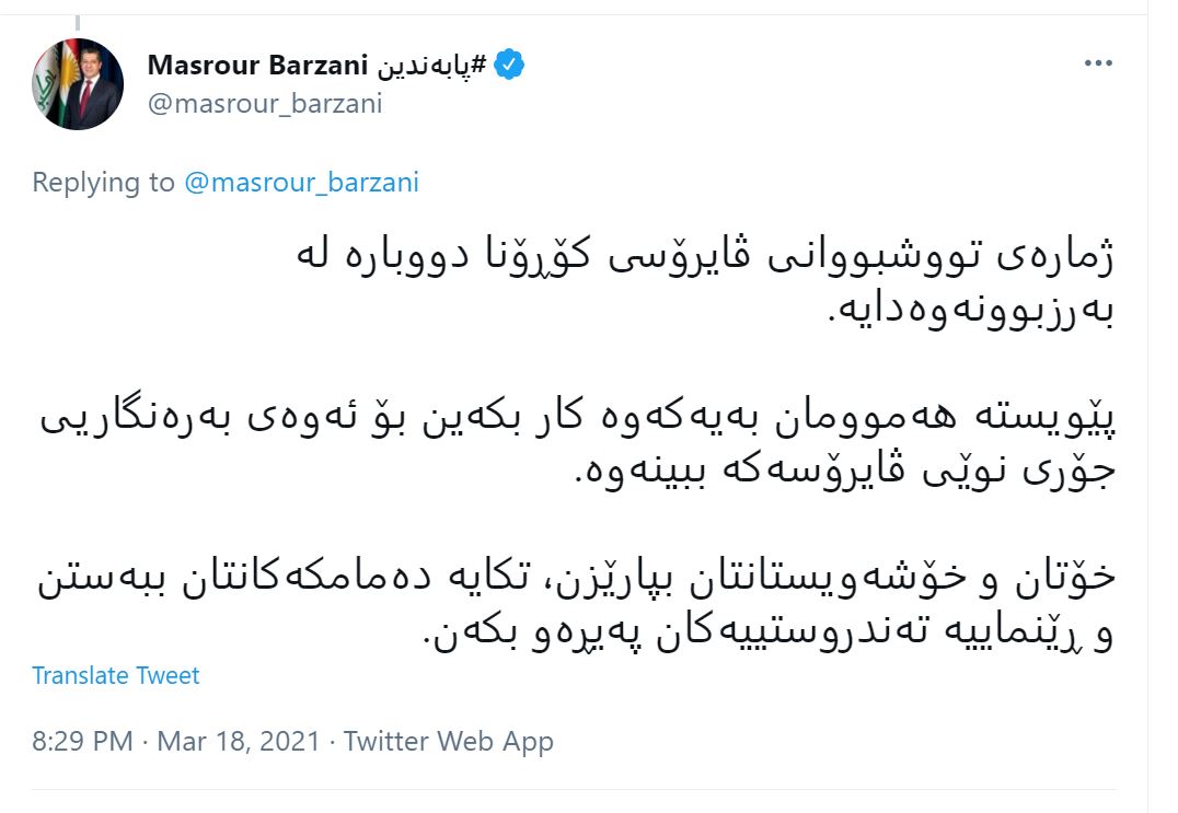اربیل (کوردستان ۲۴)- مسرور بارزانی، نخست‌وزیر اقلیم کوردستان روز پنج‌شنبه ٢٨ اسفند ۱۳۹۹ در توییت از هم‌وطنان خواست نسبت بە تشدید شیوع ویروس جدید کرونا هوشیار باشند.