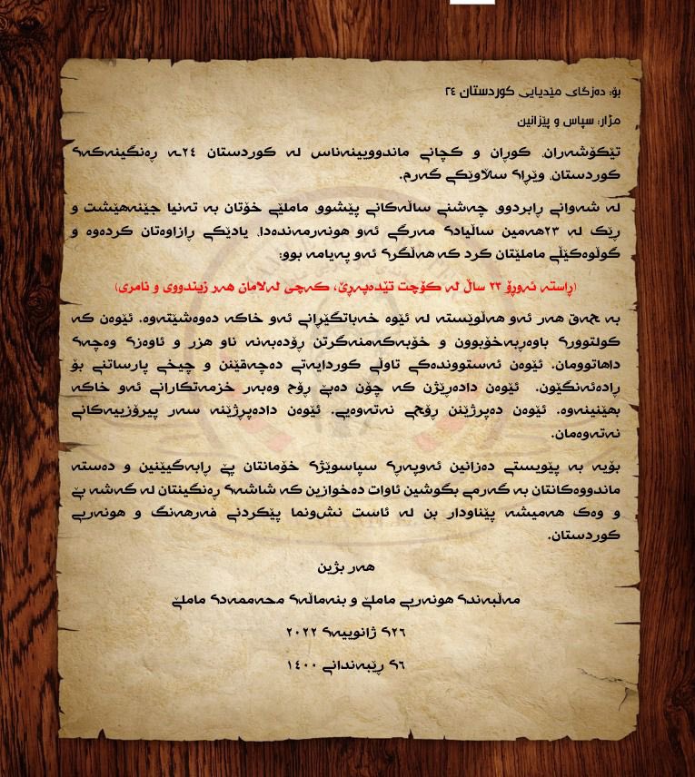 در این نامه خطاب به کوردستان٢٤ آمده است که: " به خاطر موضع انقلابیتان قدردانی و سپاسگزاری از شمارا لازم میدانیم.
