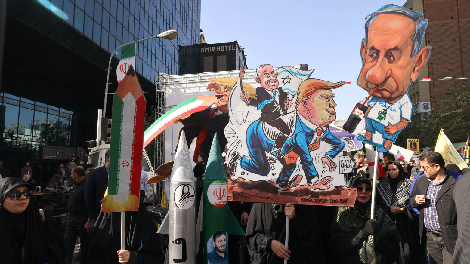 در همین حال، آدمکهای در حال چرخش ترامپ و نتانیاهو، اعدامهای عمومی که گاهی توسط ایران انجام میشود را به ذهن متبادر میکرد.