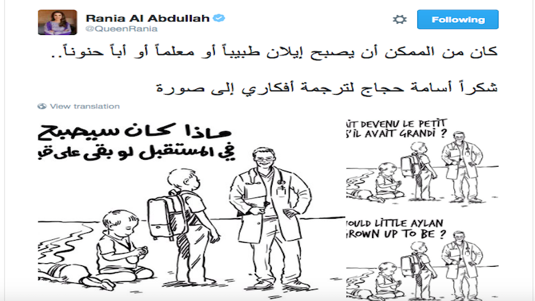 Di karîkatorê ku Şahjina Urdinê li ser rûpela xwe ya Twitterê belav kiriye, bi Erebî, Inglîzî û Fransî nivîsandiye: “Dibe ku Alan bûba pizîşk yan mamoste yan jî bavekî dilovan.”