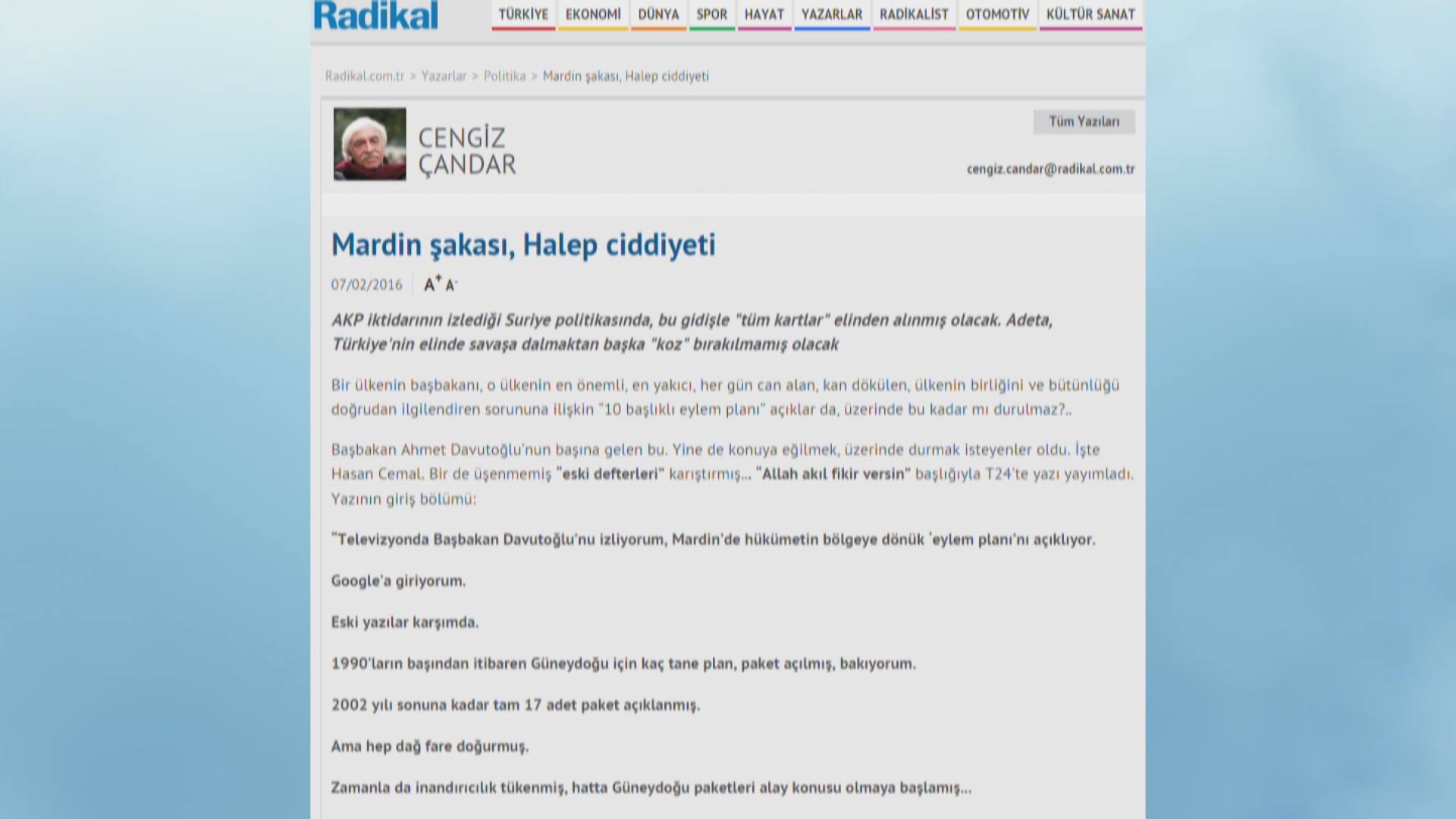 Cengiz Çandar di qunciknivîsa xwe ya di Radikalê de wiha nivîsiye; “Daxuyaniya Serokwezîr a li Mêrdînê wekî henekan e! Ev plan ji rastiyan dûr e û ne mimkûne ku pêk were. Ev plan gotina Einstein ya wekî “Kesên ehmeq her carê heman çewtiyê dikin lê li benda encameke dîtir in.” tîne bîra mirov.”