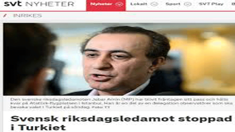Parlementerê Partiya Jîngehê ya Swêdê yê bi resen Kurd Jabar Amin, li Belafirxaneya Ataturk a li Stenbolê hate desteserkirin. Amin ligel grûbek parlementer ji bo çavderiya hilbijartinan li Tirkiye hatibû Stenbolê.