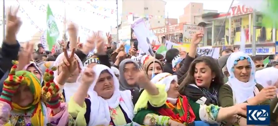 Li Wanê, ji bo hilbijartinên şaredariyan, partiyên siyasî mîtîngan lidardixin. Rojek berê Partiya Edalet û Geşepêdanê Ak-Partî mîtîn lidarxistibû û di 27'ê Adarê de jî HDP'ê bi girseyî mîtîngekî lidarxist. Di mîtîngê de, Parlamentera HDP'ê ya Elihê Feleknas Ûca bi wêneyê Leyla Guvenê derket ser dikê û anî ziman ku dê tecrîdê jî zext û pêkutiyên li ser Kurdan jî bişkênin. Ûca, rexne li Serokkomar û Serokê Giştî yê Ak-Partiyê Recep Tayîp Erdogan jî kir ku gotiye Kurdistan li vir tune ye û got: "Ev der Kurdistan e, em jî xwediyê wê ne."