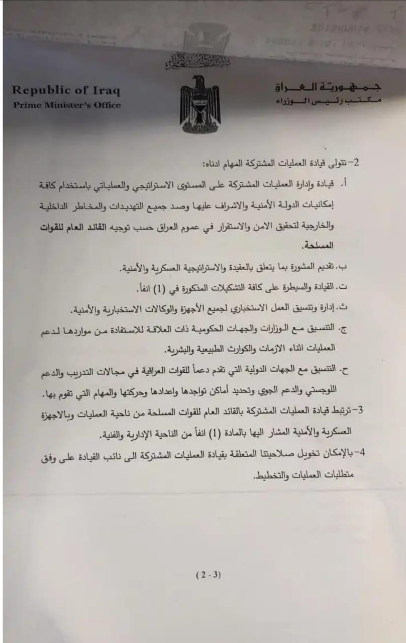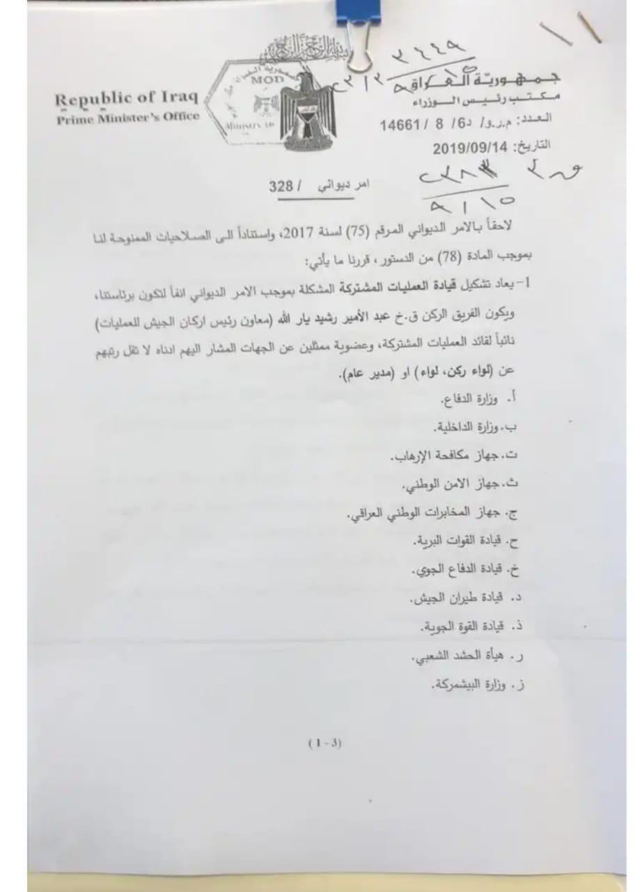 Wek di wê fermanê de hatîye, fermandeya opersyona hevpişik rasterast li jêr fermana Adil Ebdulmehdî dibe û Ebdulemîr Yarûllah jî cêgirê supasalarê Îraqê, cûgirê Ebdulmehdî dibe.