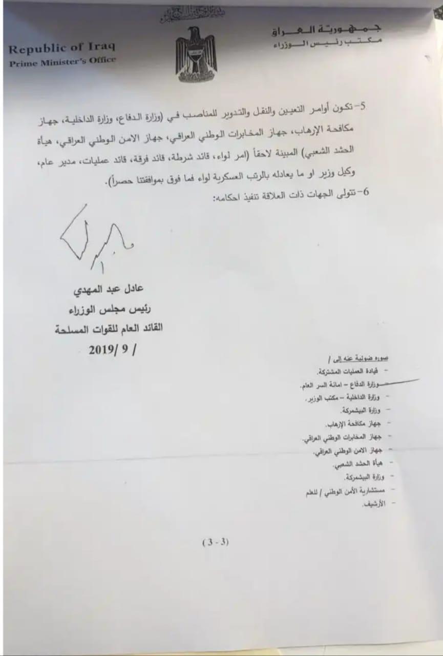 Li gor fermanekê ku wajû ya Adil Ebdulmehdî, fermandarê giştîyê hêzên çekdarên Îraqî li sere û wêneyek wê bi dest Kurdistan24 kevtîye.