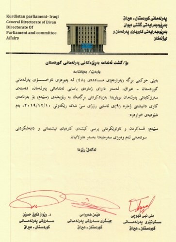 Berê jî serokatîya Perlemana Kurdistanê ragehdandibû, di evê rûniştinê de, vexwîndina dûyê bo piroje yasa ya (Rêkalamên bazirganî li Herêma Kurdistan- Îraq) û vexwîndina yekema biryara (Rojên bone yê fermîyên neteweya Turkuman) dihên kirin.