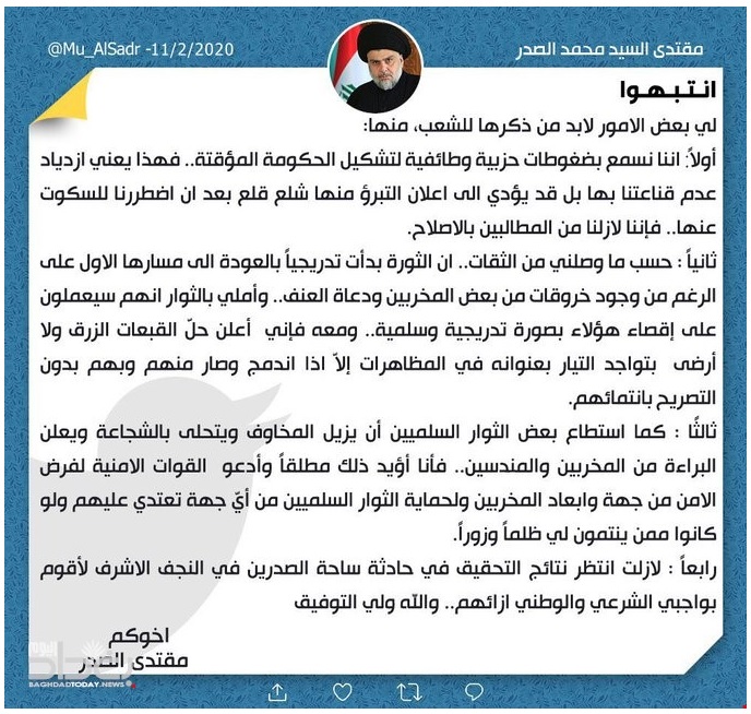 Rêberê Şepêla Sidir, Muqteda Sedir di peyamekê de li Twîtterê behsa rewşa Îraqê û xwenîşandanan û pêkanîna hikûmeta nû ya Îraqê dike û radigihîne, ew dibhîzin ku partî û aliyên siyasî fişaran li Serokwezîrên raspartî dikin, û ew yek nerazîbûnên wan zêde dike, ji ber ku  bi gotina Sedir ew hîn di rêza çaksazîxwazan de ye.