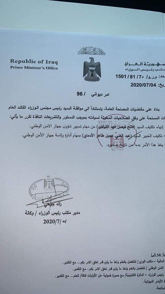 Seokê hikumeta Îraqê, Mistefa Kazimî, ferîq rukin Ebdulxenî Elesedî raspart bo serokarîya dezgeha ewlehîya nîştîmanî li şûna Falih Feyad.