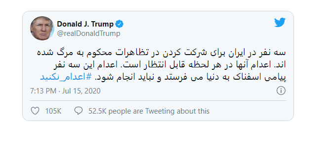 Tiramp bi zimanê Farisî tiwîtek belav kir û têde got: Sê kes li Îranê sizayê lisêdardanê bi ser wan re hatîye sepandin bi sedema pişikdarîya wan di xwenîşandanan de, cîbicîkirina sizayê di her dem de dihêt çaverê kirin, lisêdaredana wan sê kesan nameyeka cihê daxê digehîne cîhanê û nabe bihêt encamdan.