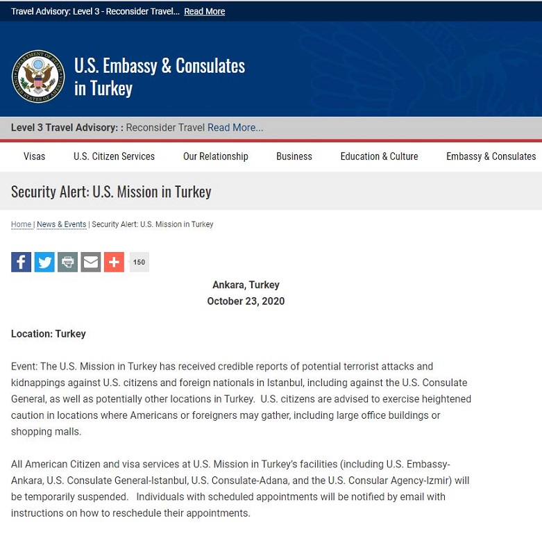 Balyozxaneya Amerîkayê ya li Enqerê li ser malpera xwe ya fermî derbarê sedema rawestandina dayîna vîzeyan de eşkere kir ku çend raportên pêbawer li ser êrîşên terorî û hewlên revandina welatiyên Amerîkî li Stenbolê gihiştine destê wan.
