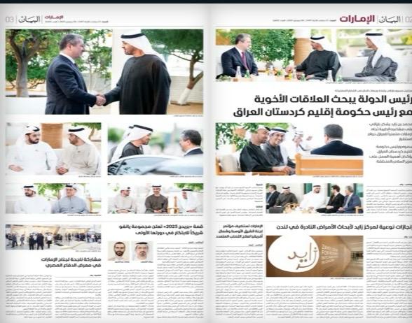 - El-Xelîc: Di manşeta xwe de got: "Mihemed bin Zayîd û Barzanî: Pêşxistina aştiyê xizmeta gelên navçeyê dike."