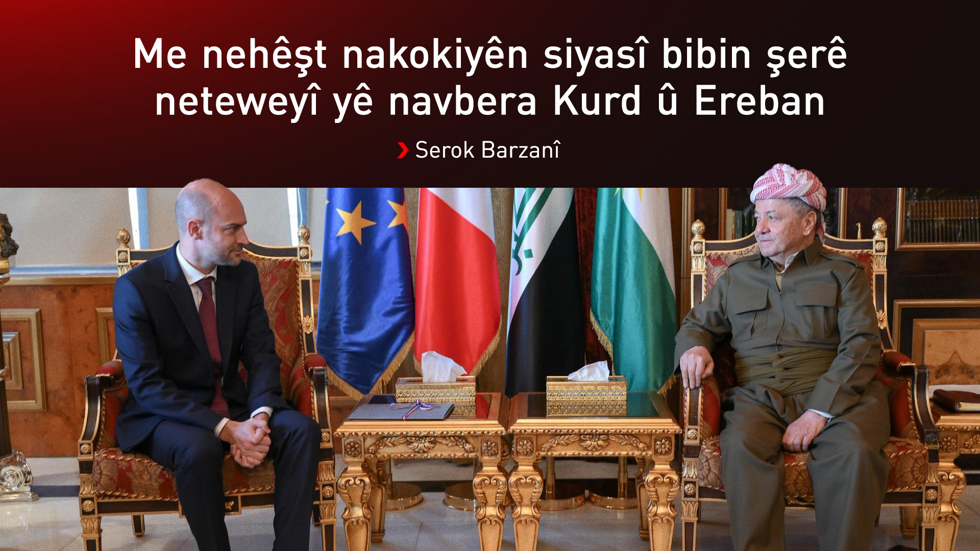 Navenda Nûçeyan (K24) – Serok Mesûd Barzanî pêşwazî li Wezîrê Derve yê Fransayê Jean-Noel Barrot kir. Di hevdîtinê de peywendiyên dîrokî yên her du gelan, rewşa Sûriyeyê, pêvajoya aştiyê ya li Tirkiyeyê û metirsiya DAIŞê hatin gotûbêjkirin.