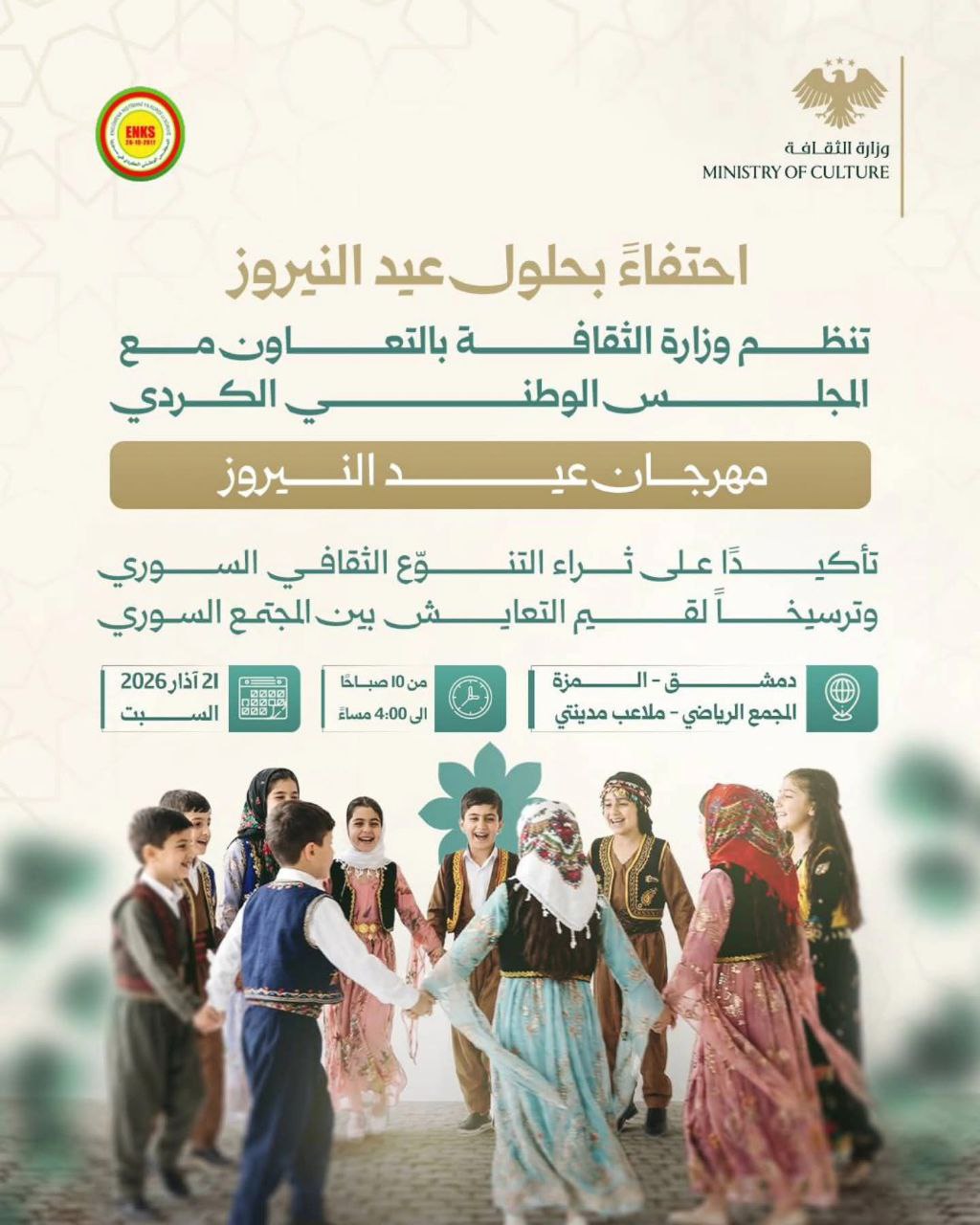 Li gorî daxuyaniya wezaretê, ahenga li Şamê roja 21ê Adarê, saet 10:00ê sibehê li Komelgeha Werzişî ya li devera Mezzê tê lidarxistin. Wezaretê destnîşan kir, ev pêngav tekeziyê li ser pirrengiya çandî ya Sûriyeyê dike û nirxên pêkvejiyanê di navbera pêkhateyan de xurt dike.