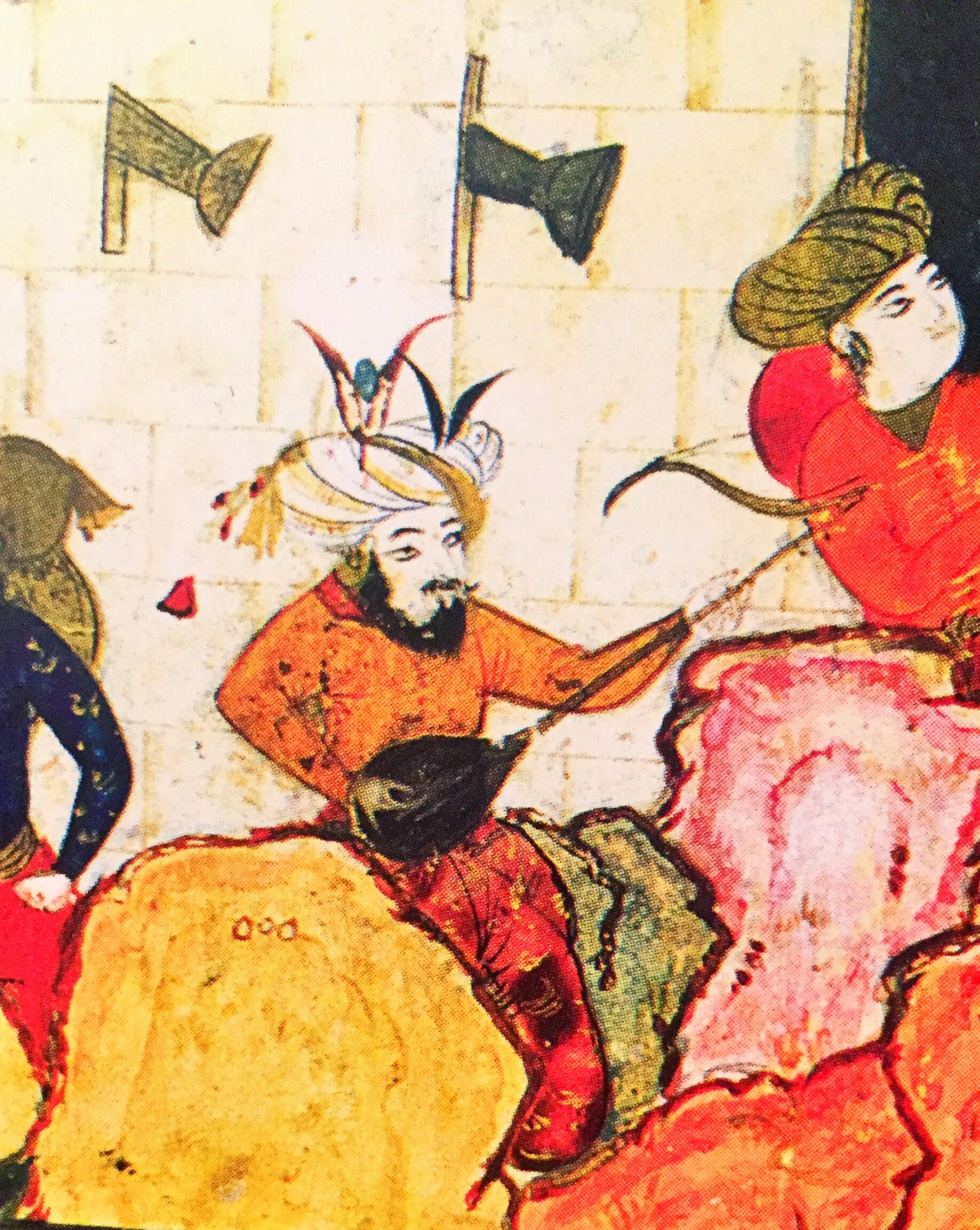 Minyatürdeki sanatçının elindeki alet, bugün Kürdistanlı Alevi ve Yaresanilerin cemlerinden tanıdığımız sazdır. Belki bugün için görüntüye aldanarak kısa bağlama denilebilir ama değildir. Biçiminden anlaşıldığı kadarıyla bu, Dede sazı ya da balta saz olarak bilinen Kürt sazı Rojba / Ruzba’dır. Anadolu’da bu isme, bir saz adı yerine bir çalma biçimi olarak da rastlansa da halen Kürdistan’ın kuzeyinde Alevilerin yoğunlukta olduğu Malatya Arguvan, Dersim Hozat ve Maraş Elbistan’da halk arasında icra edilir. Aslında kullanım alanı bundan çok daha geniştir. Aşık Veysel’in de Arif Cizrawî’nin de Êzdî aşıklar Xidir Feqîr ile oğlu Tehsîn Xidir’ın elindeki saz da budur. Erdal Erzincan, Cemil Koçgün, Ali Ekber Muradî’yi ve Hüseyin Alizade’yi de unutmamak gerekir.