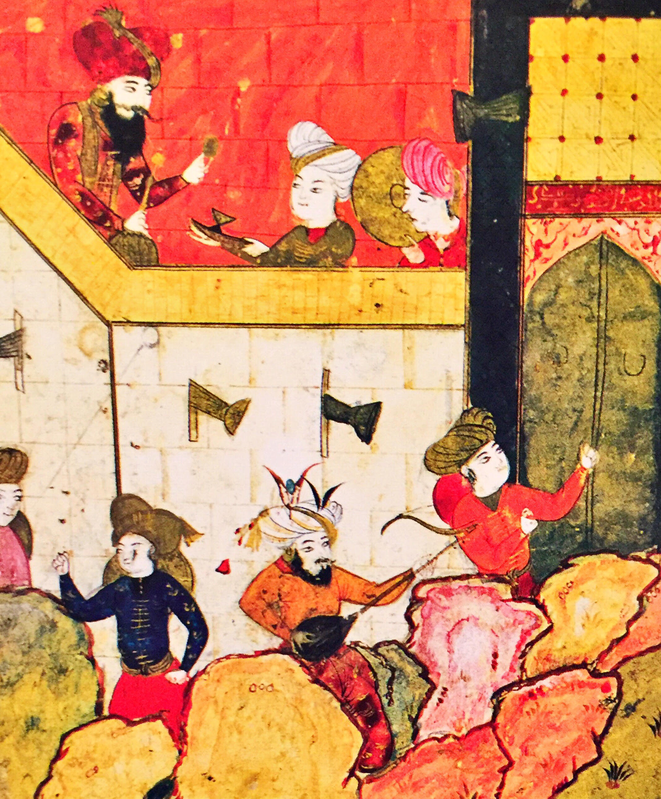 Soran mıntıkasının ünlü kale şehri Kela Dizê’nin, Daha sonra Şembo adını alacak Hakkari mirleri tarafından, o yıllarda Akkoyunlularla işbirliği yapmış olan Dümbelî Kürt aşiretinden geri alınmasını anlatan tabloda, haklı zaferini kutlayan Mîr Eso (Esededdîn) şarap içmektedir. Hemen yanı başında kalenin bedenlerinde süslü elbisesi ve başlığıyla biri ona saz dinletisi verir. Sanatçının başlığının süslemesi özellikle dikkat çeker. Biçimi, başlığa saplanmış tüyler ve başlığın üstündeki kıymetli taşlardan bu kişinin zengin ve soylu olduğu söylenebilir. Fakat diğer tablolardaki zengin ve soylulardan onu ayıran bir abartının olduğu da dikkatten kaçmaz. Şeref Xan’ın her detayı bilerek çizdiğini ve sembollere, biçimlere özellikle önem verdiğini çok iyi biliyoruz ve bu abartının da tesadüf olmaması gerekir.