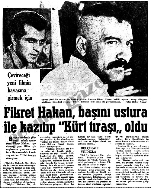 1968’den bir haber: Fikret Hakan, başını ustura ile kazıtıp “Kürt Tıraşı” oldu. Şöyle diyor haberde “Beyaz perdenin şöhretli erkek oyuncusu Fikret Hakan, çevireceği yeni film için saçlarının yanlarını ustura ile cascavlak kazıtmış ve tam Kürt tıraşı olmuştur.” Haberin ayrıntısından öğreniyoruz ki Fikret Hakan, Aydın civarlarında yaşayan ve yiğitliğiyle destan olan Balçıklı Mehmet Efe’nin hayatını filme aktarıyormuş. Denilebilir ki Aydın nere, Mehmet Efe kim ve neden Kürt tıraşı?