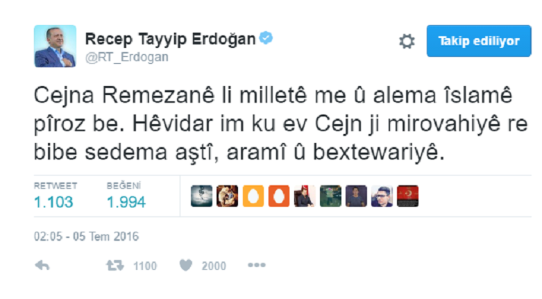 Cumhurbaşkanı Recep Tayyip Erdoğan, Ramazan Bayramı vesilesiyle Twitter hesabından paylaştığı tebrik mesajlarında Kürtçeye de yer verdi.