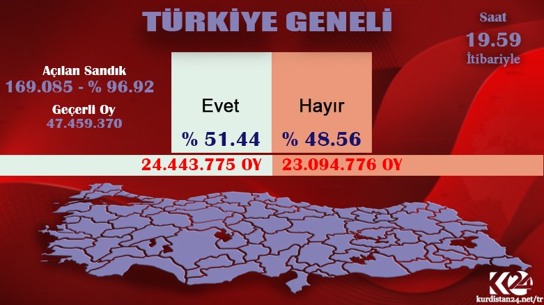 Bu verilere göre, evet oranı, 24.443.775 oyla yüzde 51.44, hayır oranı 23.094.776 oyla, yüzde 48.56