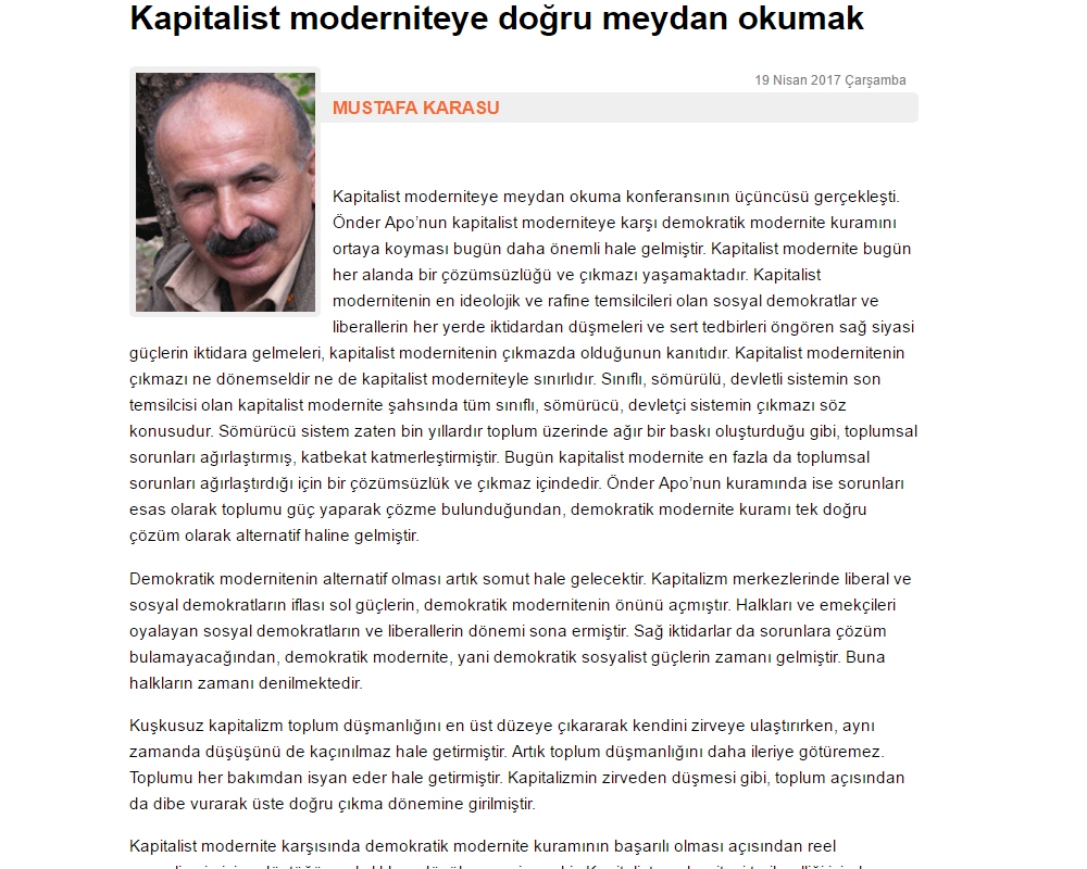 Bütün kavramların başına “demokratik” ibarelerini kullanan Mustafa Karasu, yazısında şunları dile getirdi: “Demokratik modernite kesinlikle devlete alternatif demokratik konfederalizmi esas almak zorundadır. Demokratik konfederalizm baskıyı da, sömürüyü de, endüstriyalizmi de, cinsiyetçiliği de ortadan kaldıracak demokratik toplumcu sistemdir. Halkın kendi kendini yönetme sistemidir. Gerçek demokrasidir. Sosyalizm de ancak böyle bir demokratik toplum ve demokratik konfederal sistemle gerçekleşir. Kapitalizm de ancak böyle ortadan kaldırılabilir. Demokratik komünal ekonomi, demokratik toplumla; demokratik toplum da ancak komünalizmle var olabilir. Bu yönüyle gerçek demokrasiyle sosyalizm özdeştir. Klasik sosyalizm literatüründe ifade edildiği gibi demokrasi bir devlet biçimi değildir; devletin alternatifidir.”