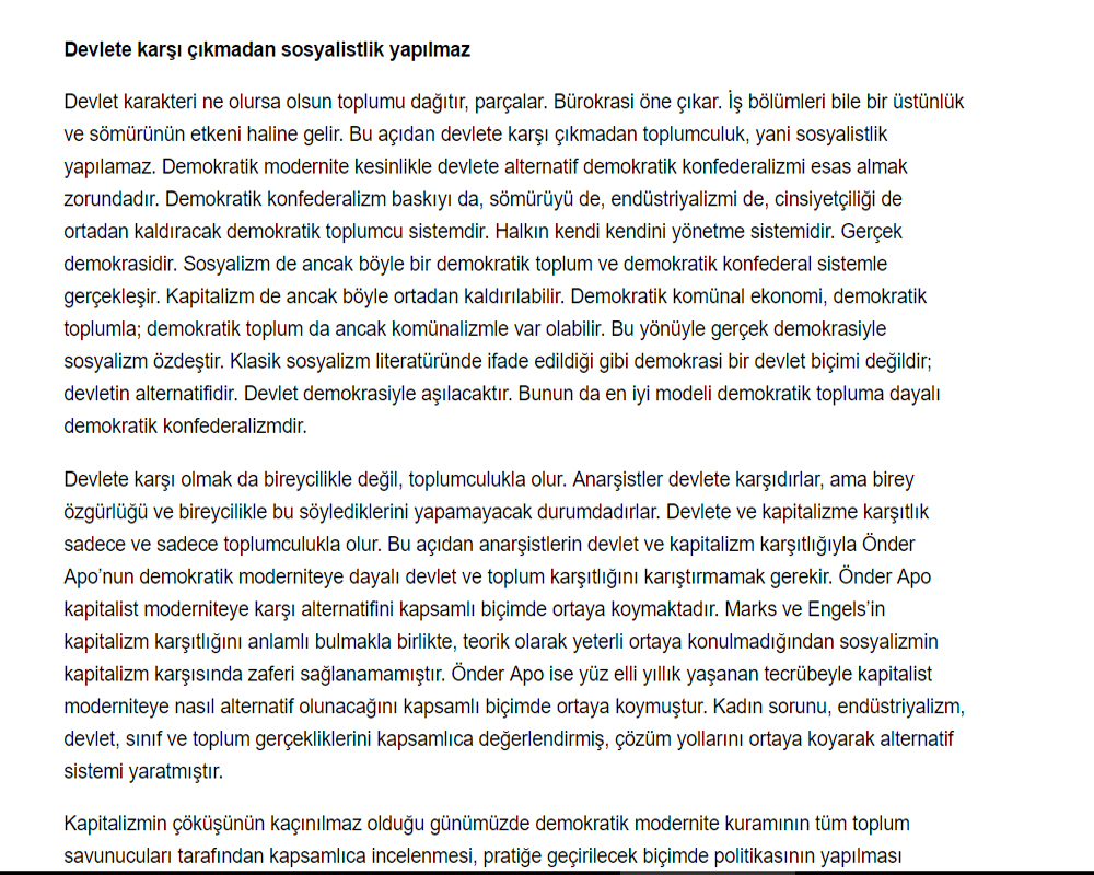 Yazısında sık sık Marks ve Engels’in teorilerine göndermeler yapan Karasu, Kürtlerin kurtuluşunun sosyalizmde olduğunu öne sürdü. Yazısında sadece devletsizliği değil ailenin dağıtılması gerektiği görüşünü de savunan Karasu, şu ifadeleri kullandı: