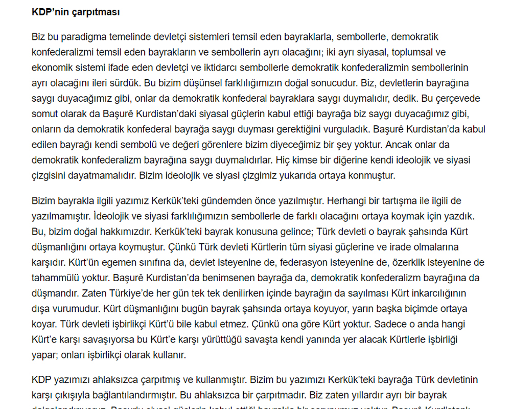 Yazısında Kürdistan bayrağı ile ilgili de değerlendirmelerde bulunan Mustafa Karasu, Kürdistan bayrağının kendilerini temsil etmediğini dile getirdi. Karasu, kendilerinin demokratik konfederalizmi sembolize eden bayrakları tercih ettiklerini söyledi.