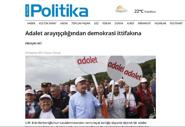 Karasu Yeni Özgür Politika gazetesinde “Hüseyin Ali” takma ismiyle yazdığı “Adalet arayışçılığından demokrasi ittifakına” başlıklı yazısında, CHP’nin, milletvekilleri Enis Berberoğlu’nun tutuklamasını protesto için Ankara’dan İstanbul’a başlattığı yürüyüşe destek verdiklerini açıkladı.