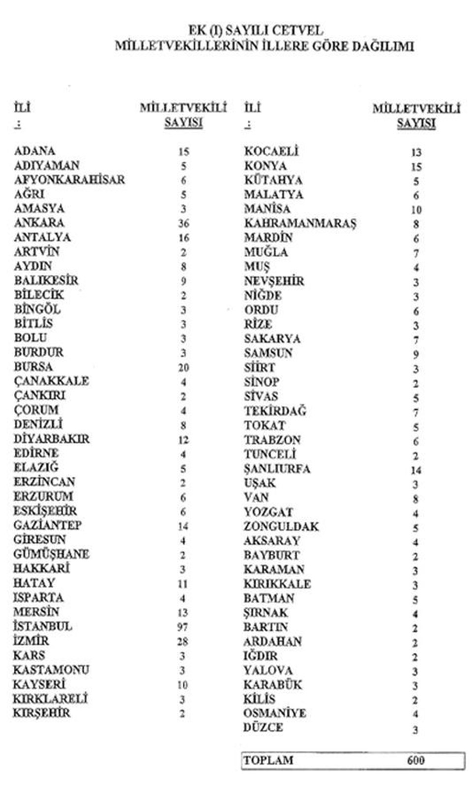 Referandumla kabul edilen anayasa değişikliğiyle 600 olan milletvekili sayısına göre illere dağılım yaptı. 32 ilin milletvekili sayısı arttı. Milletvekili sayısında en çok artış, İstanbul ve Ankara'da oldu.